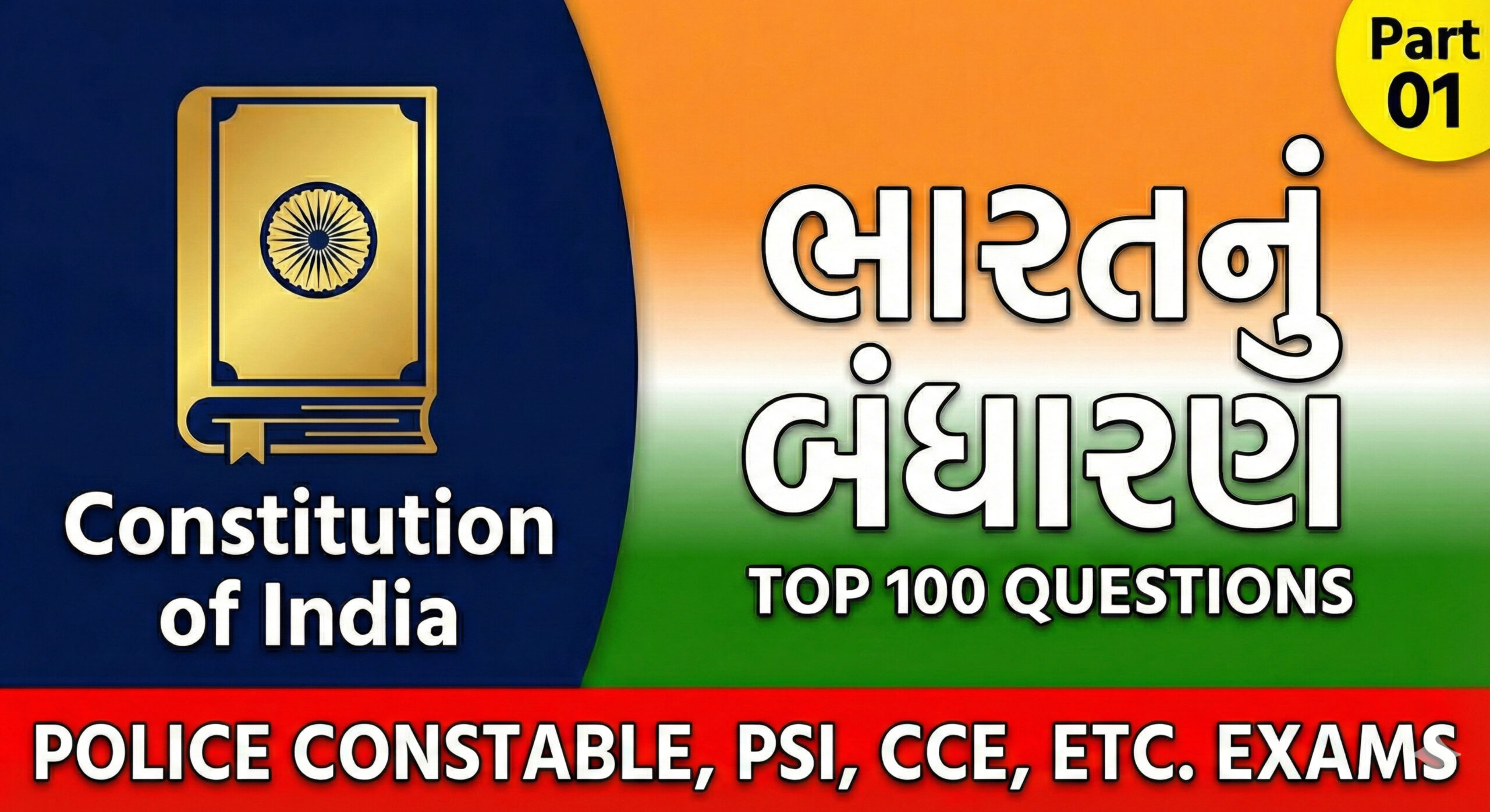 Bandharan Top 100 MCQs Questions in Gujarati 01 : અહીં આપવામાં આવેલા 100 MCQs પ્રશ્નો આવનારી પોલીસ કોન્સ્ટેબલ, PSI, CCE, GSSSB, વગેરે પરીક્ષા માટે IMP છે. ભારતીય બંધારણના વિવિધ પાસાઓને આવરી લેતા 100 બહુવિકલ્પી પ્રશ્નો (MCQs) છે, જે સરળથી અઘરા (Easy to Hard) સ્તરે ગોઠવવામાં આવ્યા છે. ✅️ તમારી સરળતા